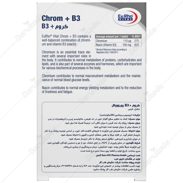 میزان مصرف قرص کروم ب3 یوروویتال در افراد بزرگسال روزانه 1 عدد با اب کافی میباشد. |